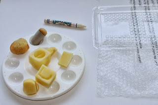 Eindelijk weer wat ruimte in mijn hoofd (ook letterlijk; holtes weer redelijk schoon) om weer wat "vrij" werk te doen. Lekker schilderen om het schilderen. Geen doel, waardeloos materiaal als bubbeltjesfolie, vleeswarenschaaltjes, aardappelstempels en lekker groot papier. 1 vel papier heb ik voorbewerkt met gesso. Een kloddertje gesso op een stuk karton gedaan en daarmee horizontaal en vertikaal over het papier gekrast. Zo kwamen er brede stroken gesso op het vel, maar ook stukjes met smalle lijntjes en gekke vormpjes. Heel erg onwillekeurig het gesso weggestreken tot de klodder op was. Qua oppervlak was nu ongeveer 1/3 deel gesso en 2/3 deel blanco. De gesso zat uiteraard wel over het hele vel verspreid. Wit op wit is niet duidelijk te zien, maar dit is het resultaat: